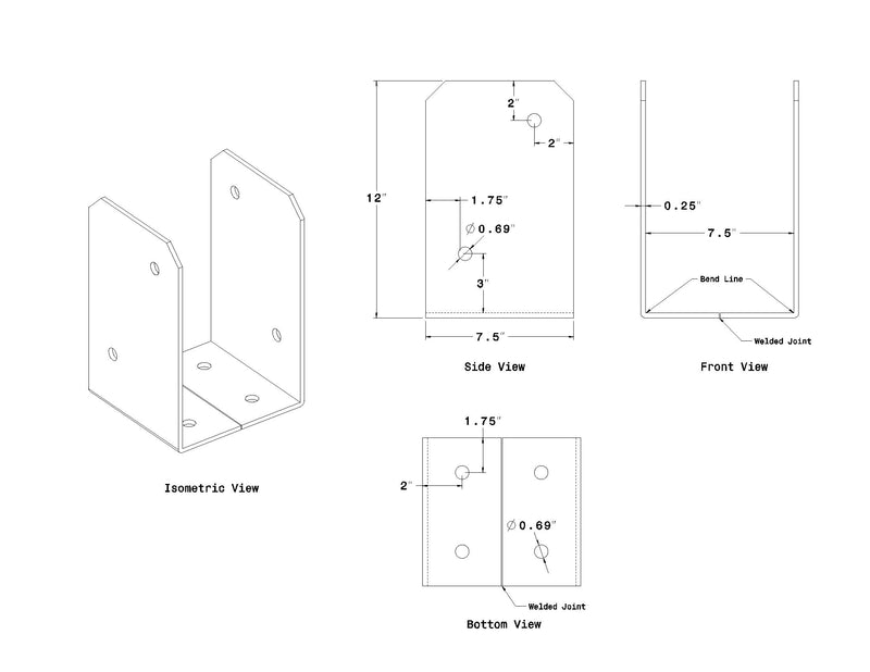 Post Base - 7.5 inch x 7.5 inch x 12 inch tall. Made from 1/4 inch thick steel plate